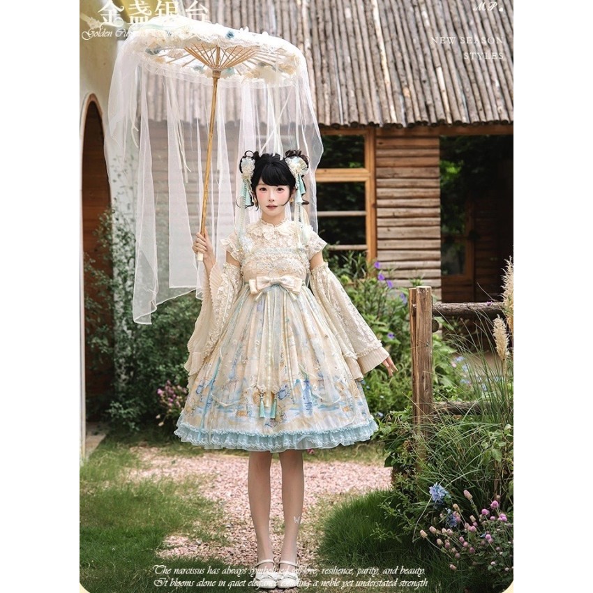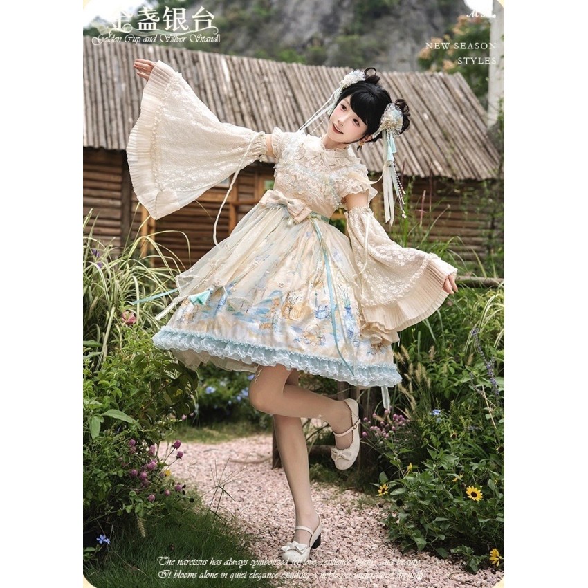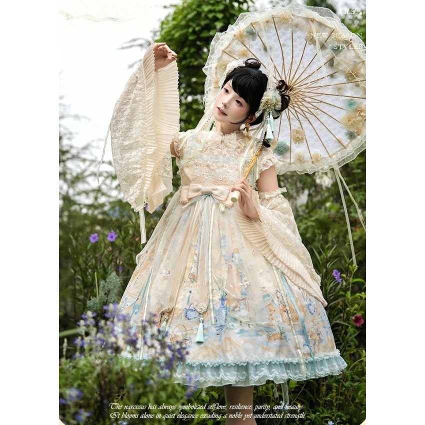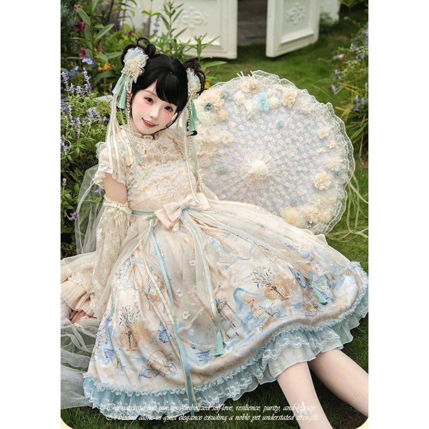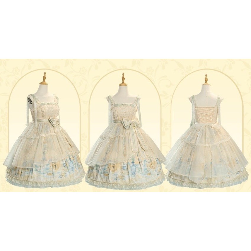 The JSK is shirred on the back. The listed Bust and Waist measurements are laid flat measurements of the JSK without stretching the back shirring. However, it's not recommended to stretch the back shirring or do not stretch more than about 3cm in case of tight fitting(For your reference only).