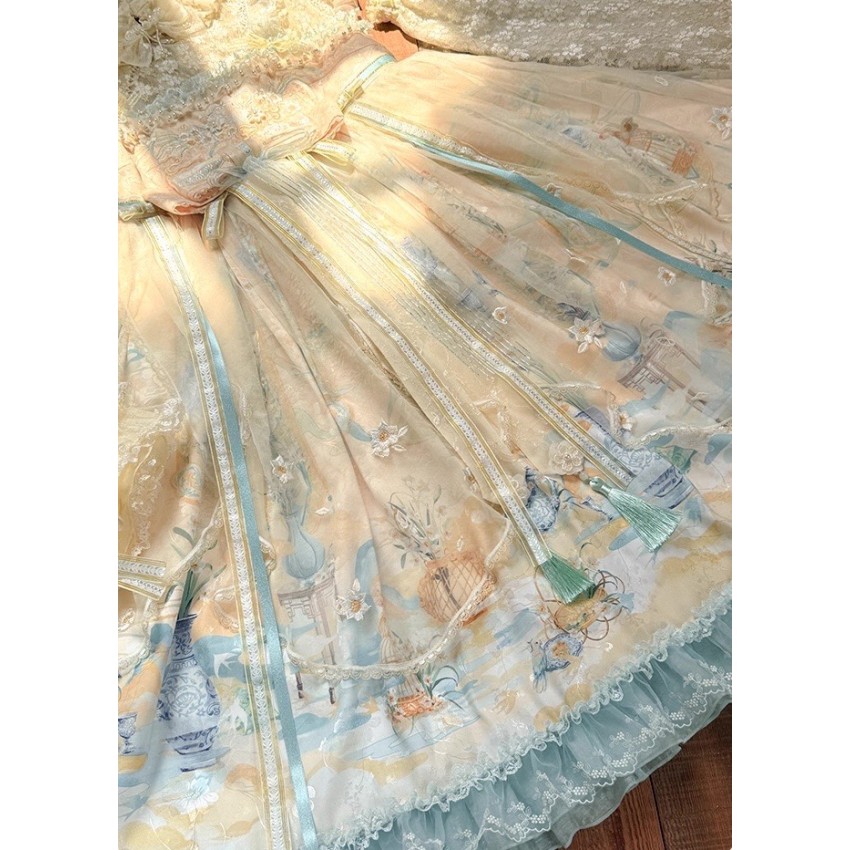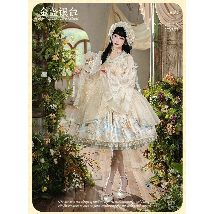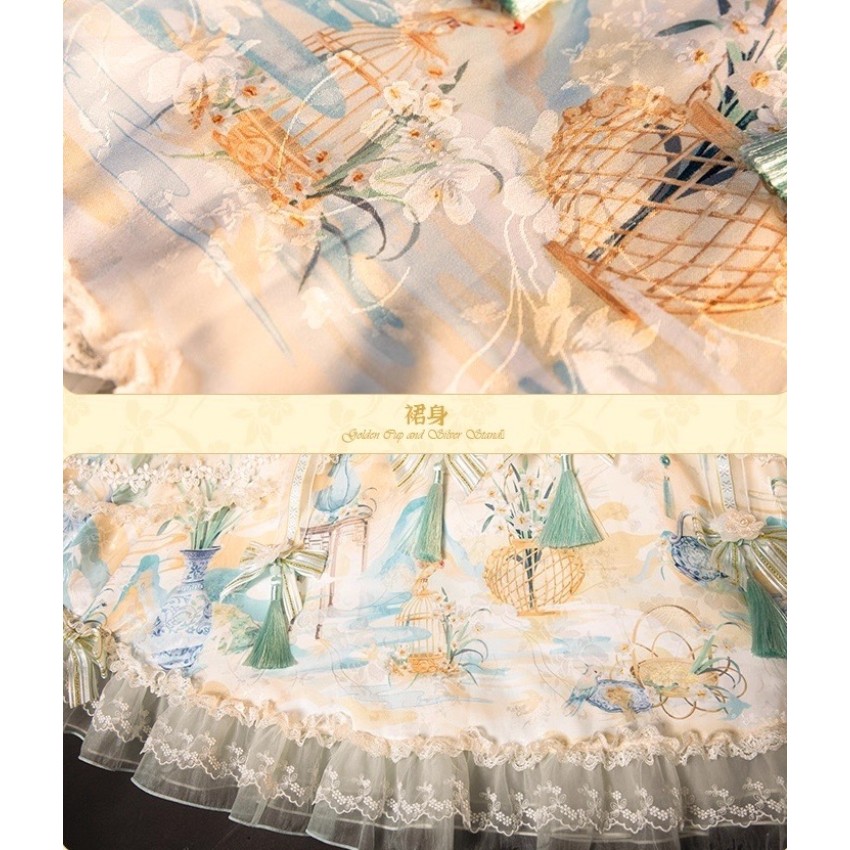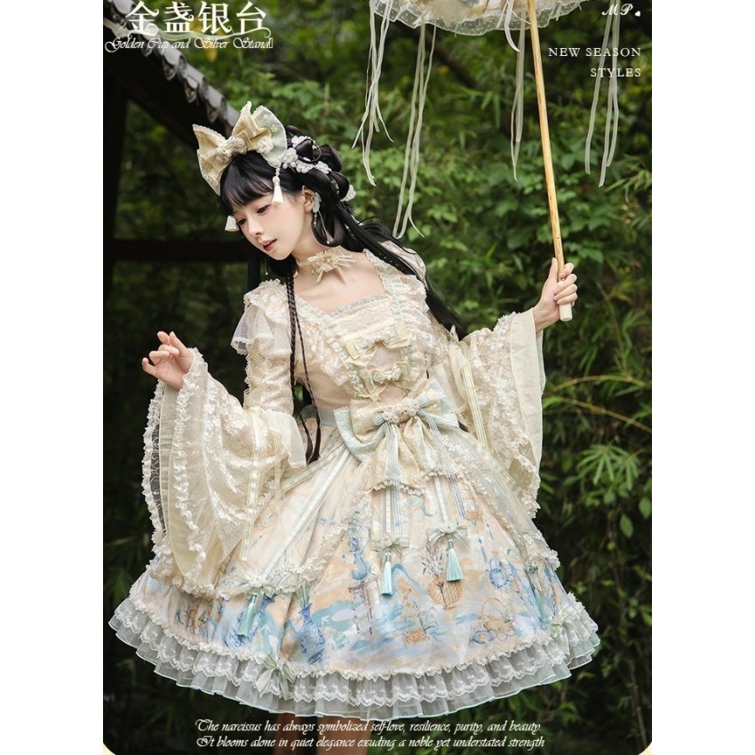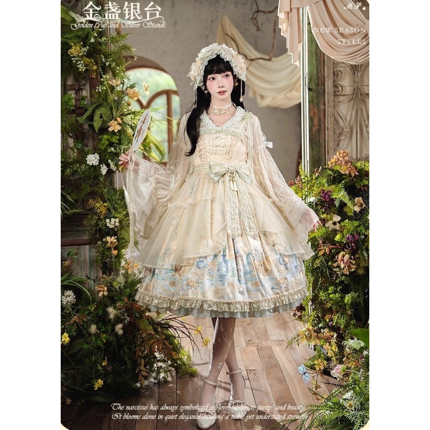 The JSK is shirred on the back. The listed Bust and Waist measurements are laid flat measurements of the JSK without stretching the back shirring. However, it's not recommended to stretch the back shirring or do not stretch more than about 3cm in case of tight fitting(For your reference only).